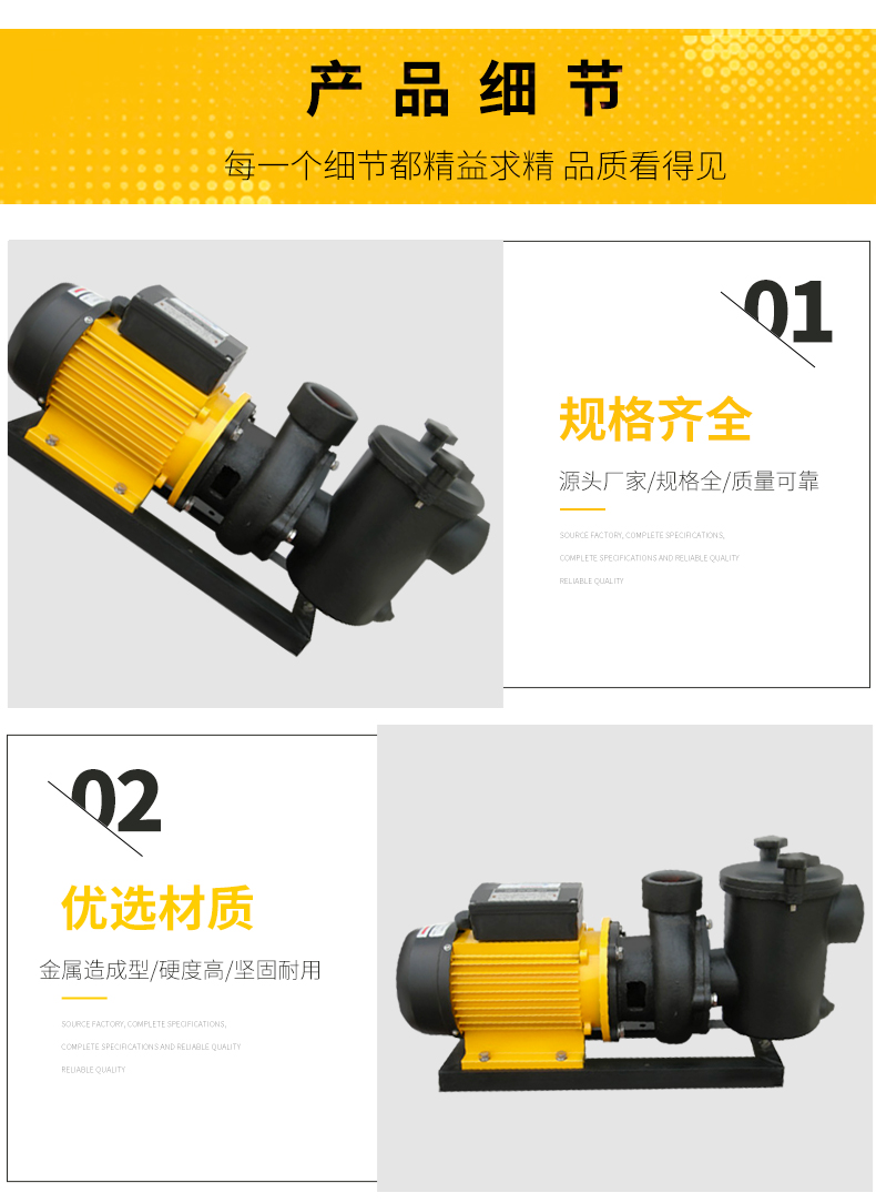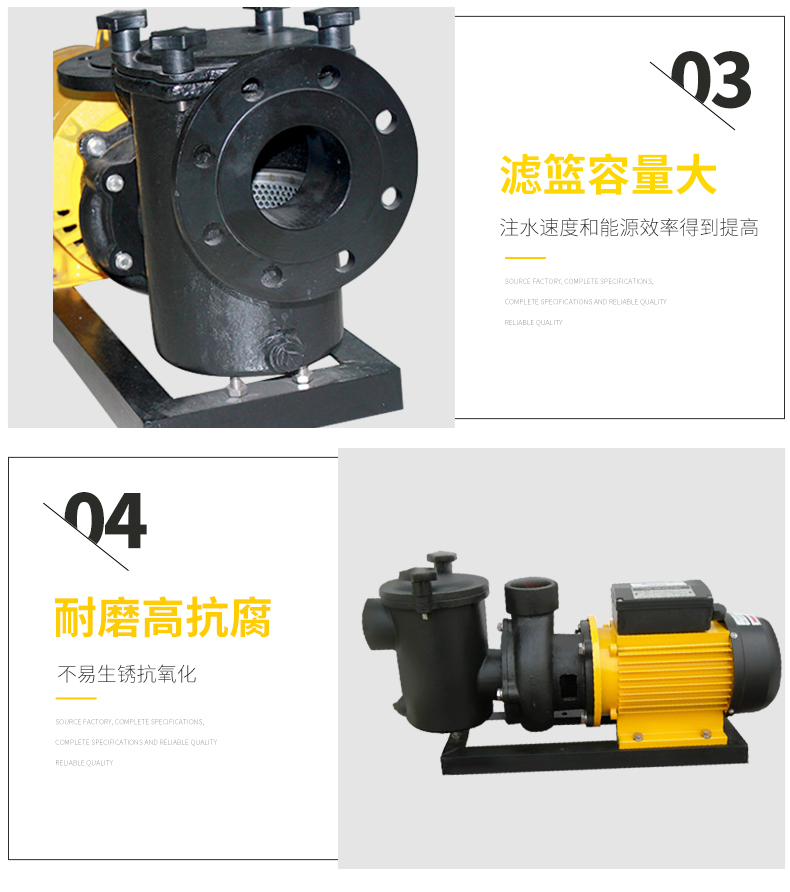 - 根據(jù)水力學(xué)原理設(shè)計的泵體,用金屬造成型,堅固的一體式結(jié)構(gòu),經(jīng)久耐用。濾籃容量大,大大減少了清洗工作。性能好,效率高,加快了注水(灌溉)速度并提高了能源效率。適用于各種泳池、工業(yè)用水、海洋館、水上樂園等。