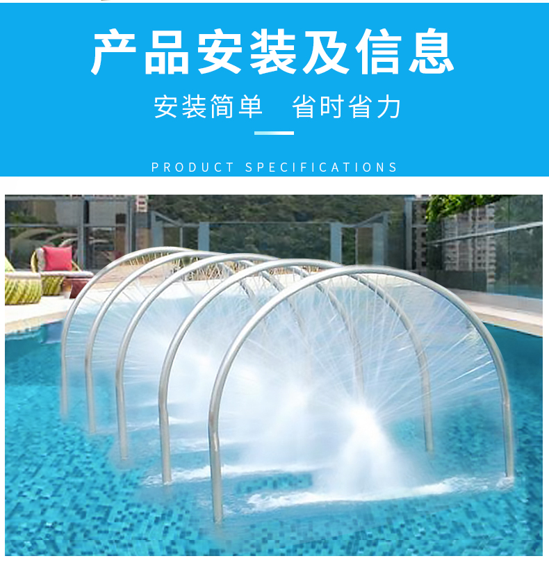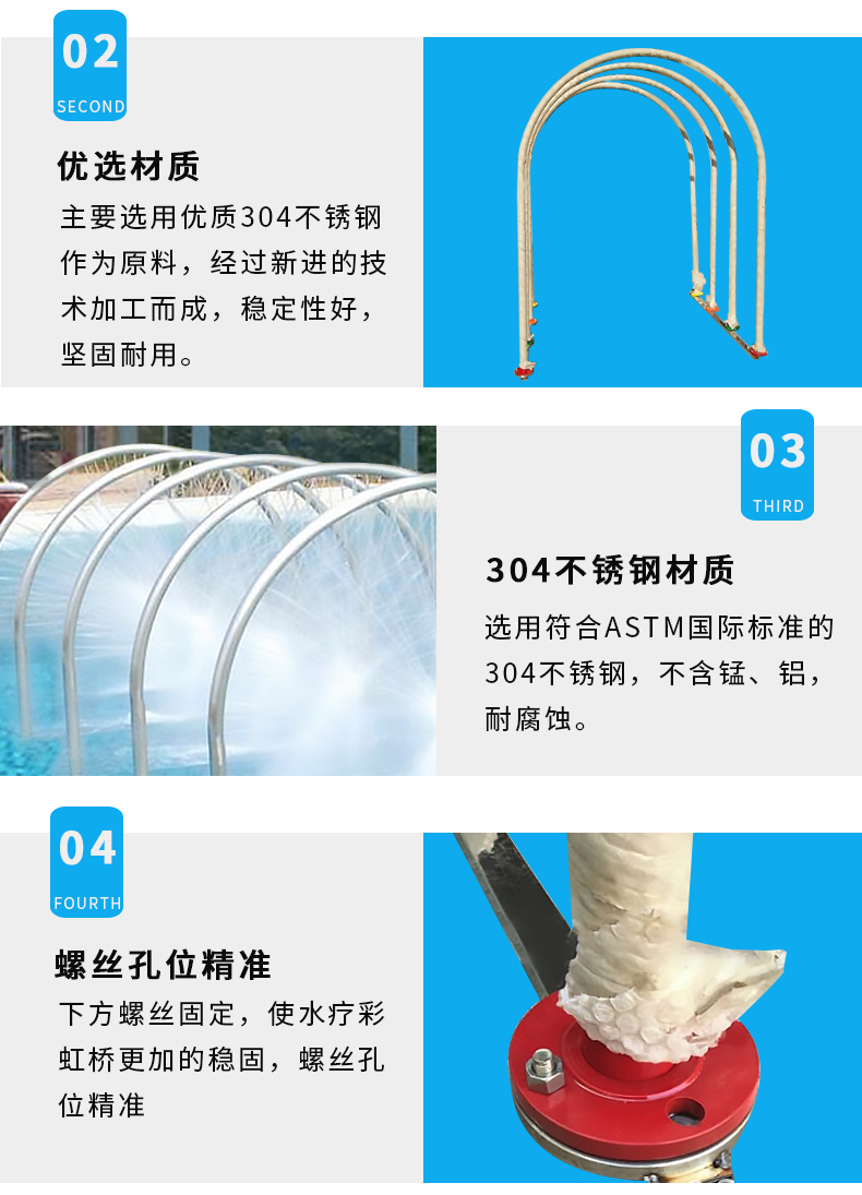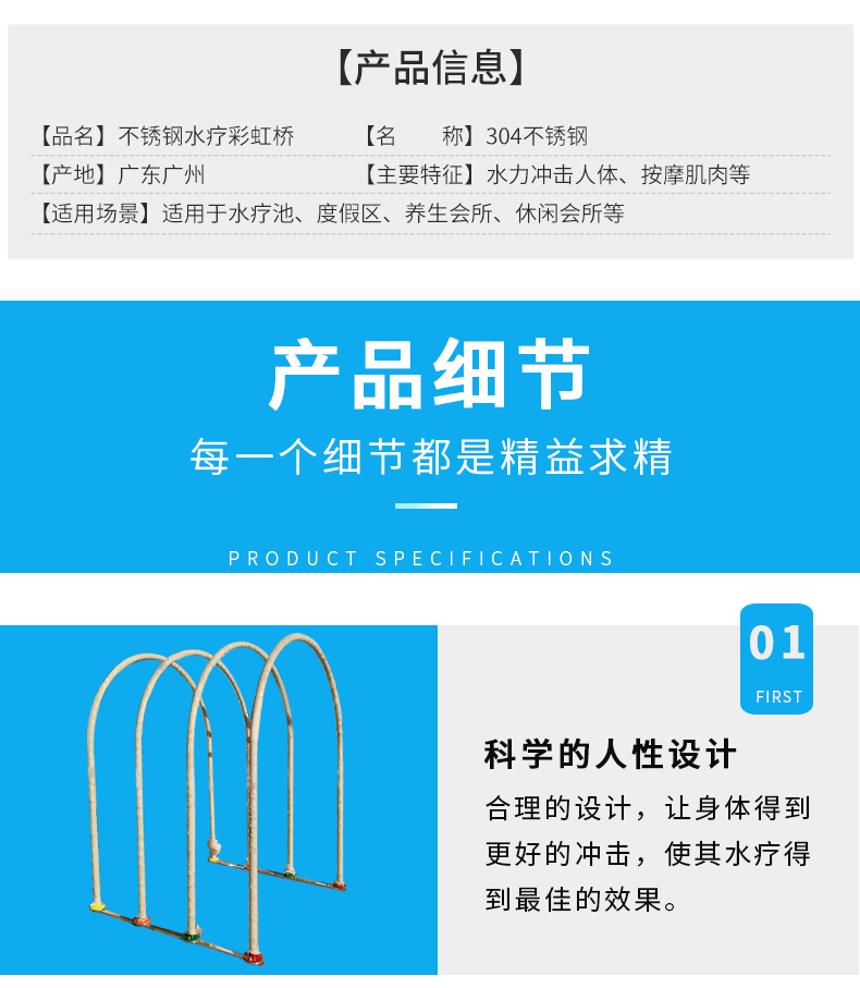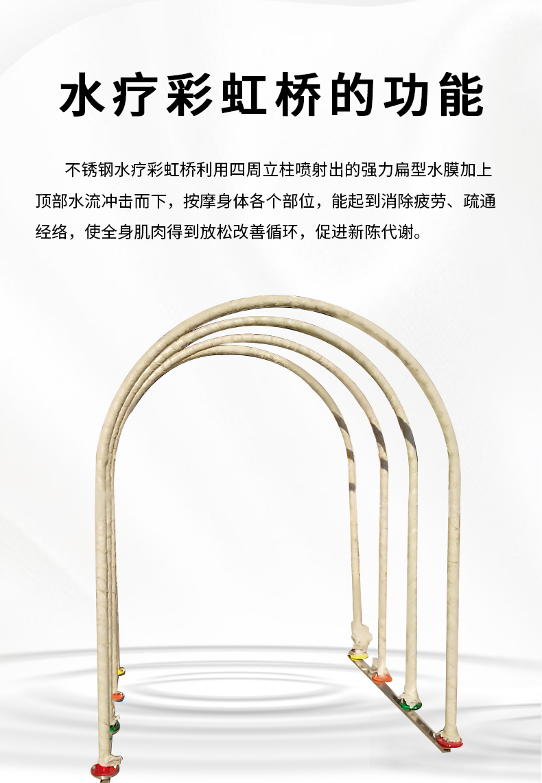 - 不銹鋼水療彩虹橋利用四周立柱噴射出的強(qiáng)力扁型水膜加上頂部水流沖擊而下,按摩身體各個部位,能起到消除疲勞、疏通 經(jīng)絡(luò),使全身肌肉得到放松改善循環(huán),促進(jìn)新陳代謝。