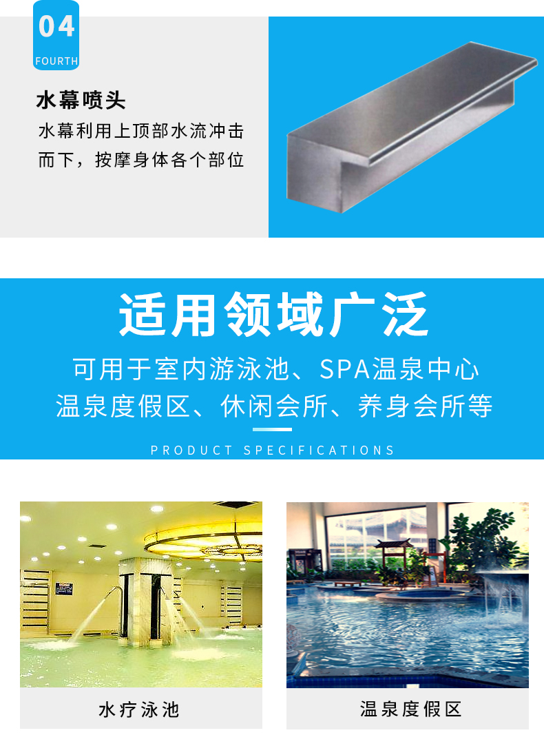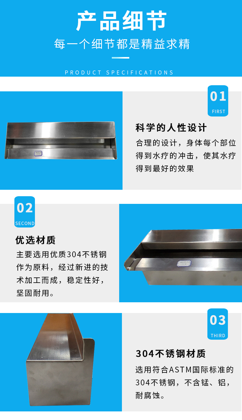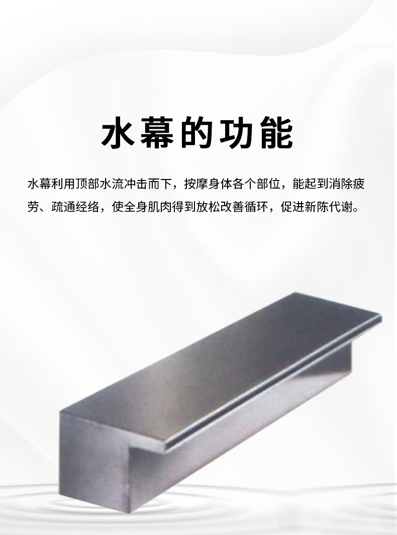 水幕利用頂部水流沖擊而下,按摩身體各個(gè)部位,能起到消除疲勞、疏通經(jīng)絡(luò),使全身肌肉得到放松改善循環(huán),促進(jìn)新陳代謝。
